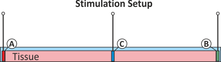 Fig. 62 Simple setup for testing the various configurations for extracellular stimulation. Three electrodes are pre-defined, electrode A and B located at the left hand face and right hand face of the tissue strand, respectively, and an additional auxiliary electrode C sitting on top of the strand in its center.