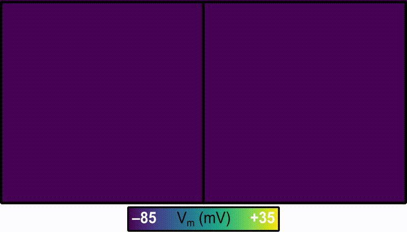 With the default parameters, the program will perform the two simulations as described above. When the vm.igb files are visualized, it will be apparent that the depolarisation patterns are approximately the same but the repolarisation sequences are markedly different due to the variable representations of GKr/GKs heterogeneity. The side-by-side animation shown here is for the vm sequences produced by the test using the default parameters: