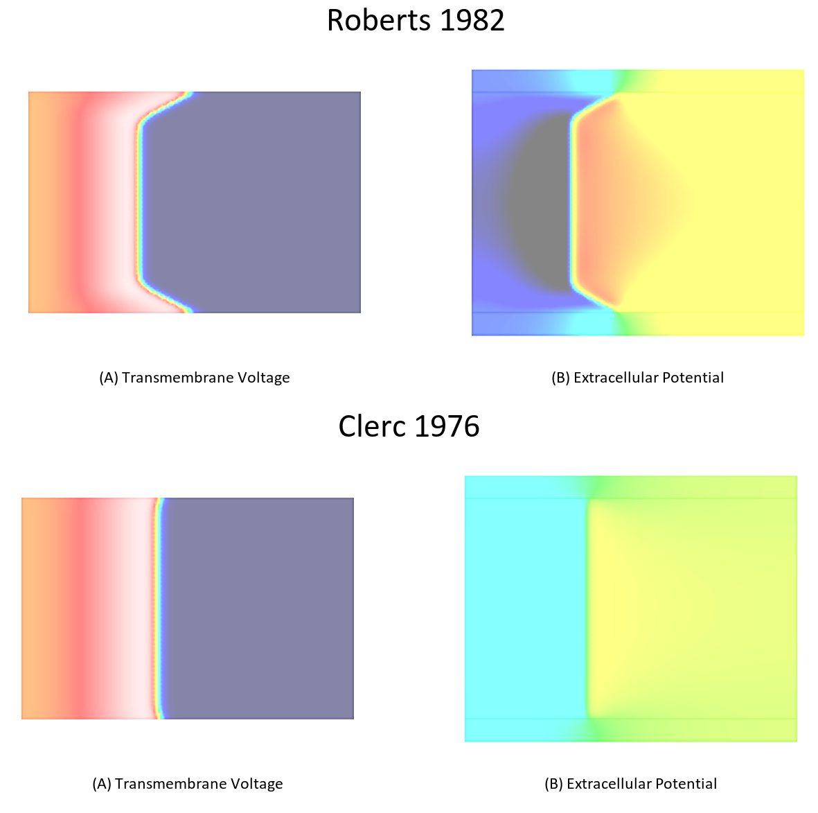 Fig. 103 Differences in bath loading when using either the conductivity values of Clerc [2] or Roberts [4]. Notice the much stronger bath loading effect, as evidenced by the V-shape of the wavefront close to the tissue bath interface, in the Roberts case. Using the Clerc conductivities the interstitial longitudinal conductivity of 0.625 S/m is almost as high as the bath conductivity.