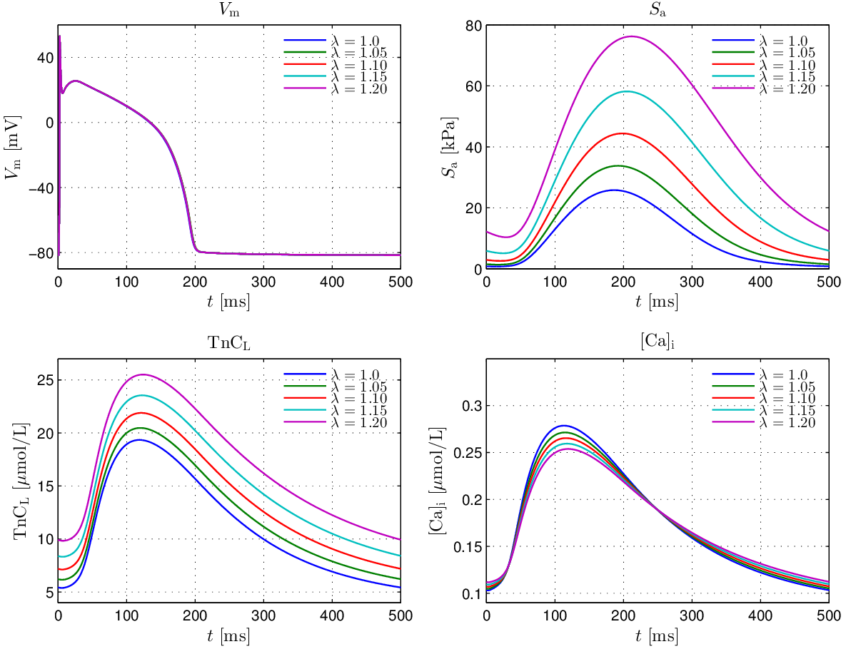In this set of experiments we couple the recent EP model of the human ventricular myocyte due to Grandi et al [6] (Grandi-Pasqualini-Bers GPB) with the active tension model due to Land et al [4] (Land-Niederer LN). Details on the implementation and parameterization of the coupling have been reported in detail in Augustin et al [9].
