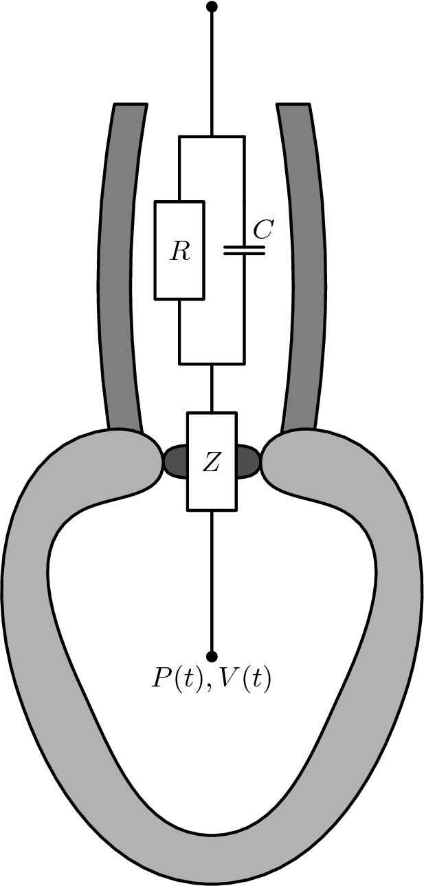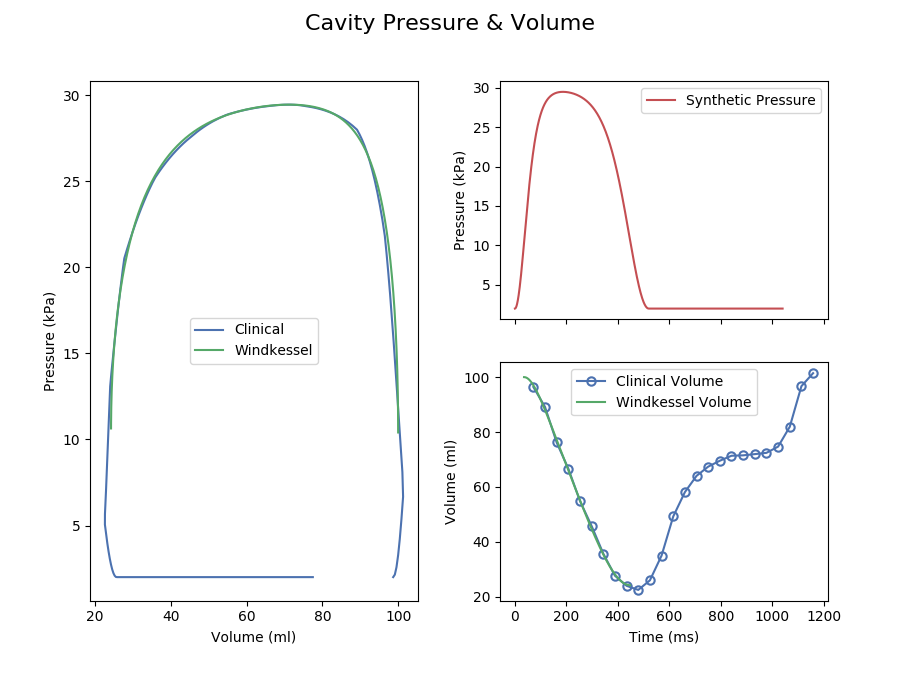 To provide suitable pressure boundary conditions for the EM-simulations, we use the three element Windkessel model to obtain the pressure trace from the volume. The three element Windkessel model is a simple model of afterload on the ventricle and can be written as the following ODE