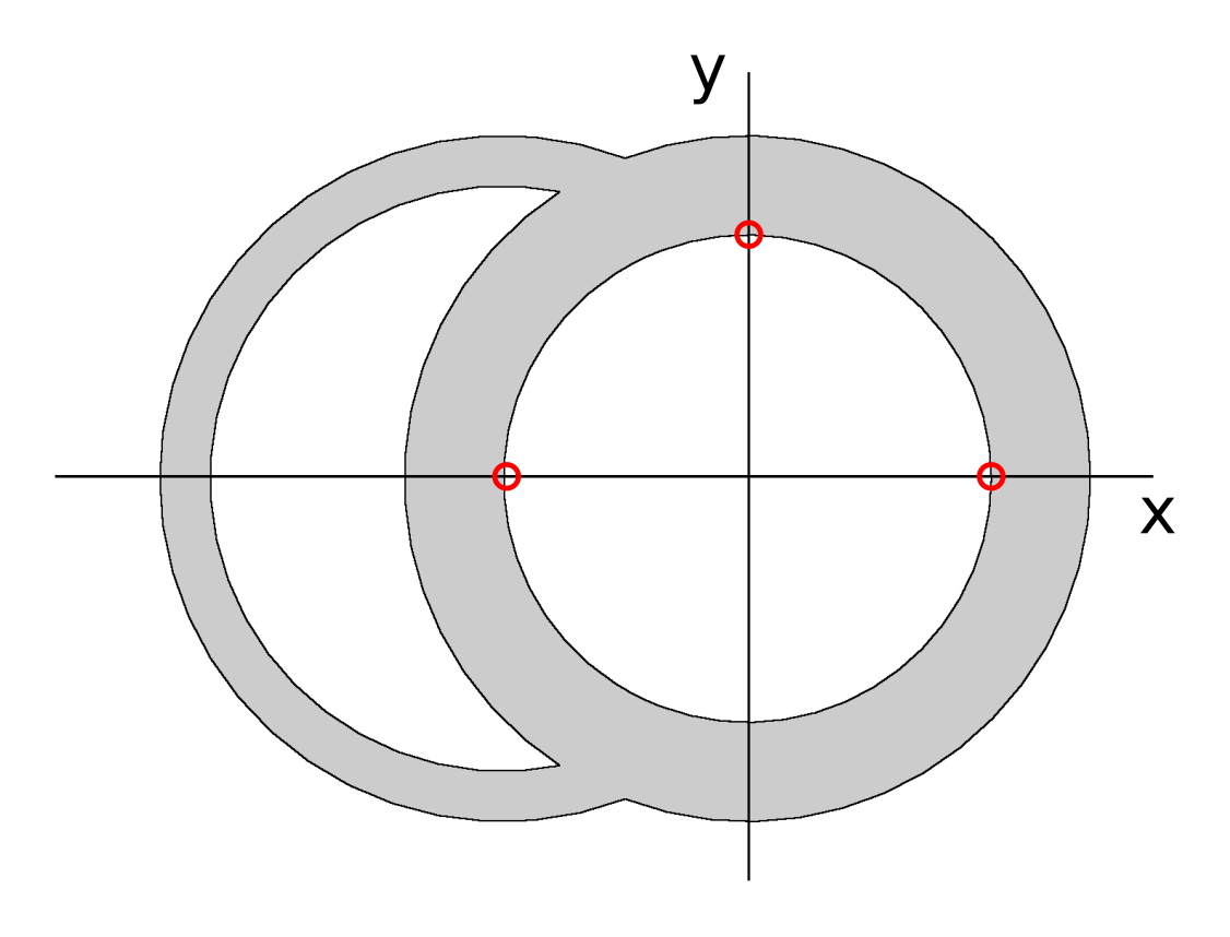 Two nodes on the x axis are prevented from moving in the y direction, and one
