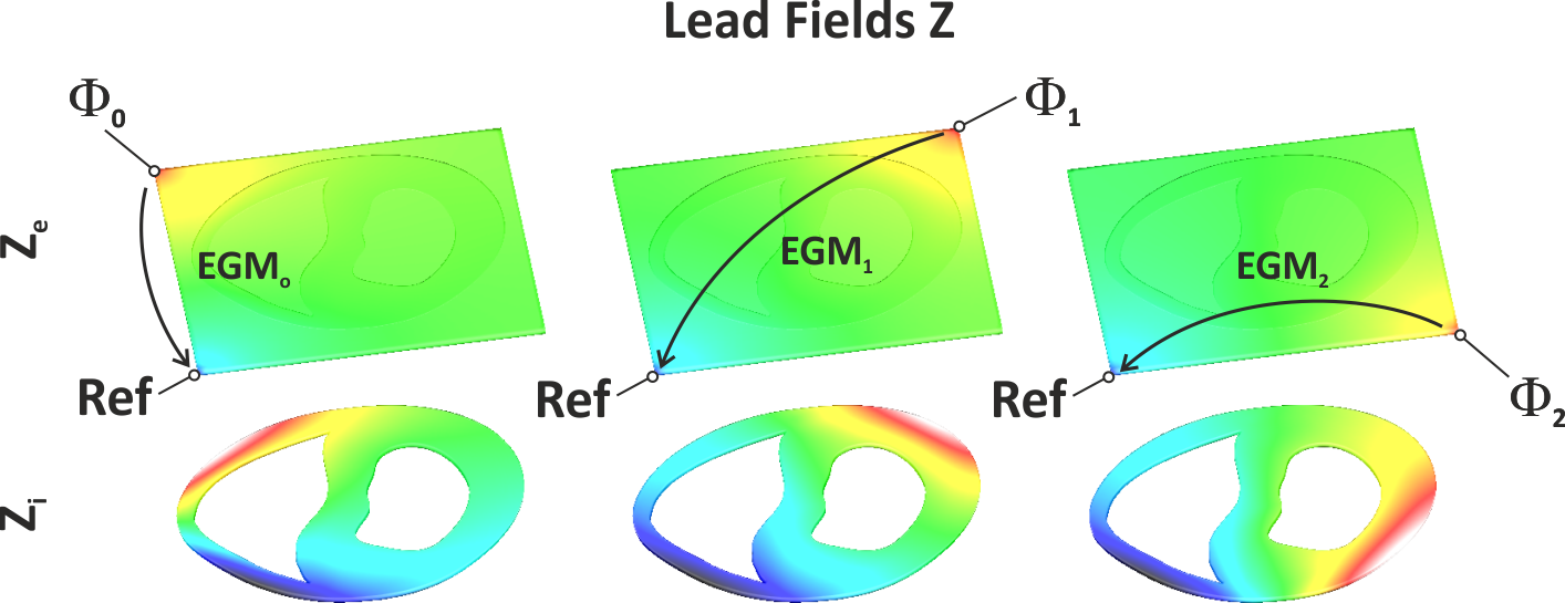 Fig. 29 Shown are the lead fields Z for three EGMs. In all cases the reference electrode is located at the lower left corner of the bath. Electrodes for computing buoikar EGNs relative to the chosen reference are located at the lower right corner :math:’Phi_0’, the upper left corner, :math:’Phi_1’ and the upper right corner, :math:’Phi_2’.