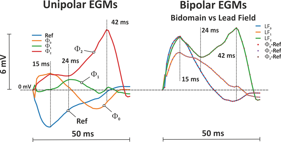 Fig. 31 Left panel: Shown are the extracellular potential traces recorded at the four corners of the bath. Right panel: Shown are bidomain traces (dotted lines) next to those computed using the lead field approach, showing that the lead field yields the exact bipolar bidomain EGMs.